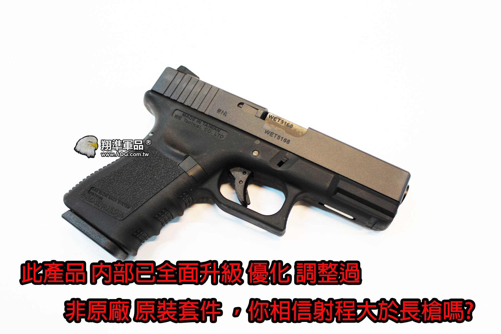 影片測試 可至YOUTUBE 搜尋: 【翔準國際AOG】31.4公尺 十發中十發 精密管 測試影片 瓦斯手槍 WE GLOCK